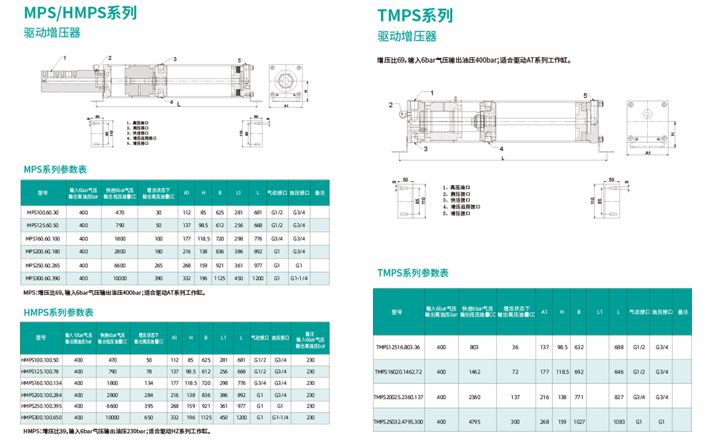 MPS:增壓比69,輸入6bar氣壓輸出油壓400bar;適合驅(qū)動(dòng)AT系列工作缸 HMPS:增壓比39,輸入6bar氣壓輸出油壓230bar;適合驅(qū)動(dòng)HZ系列工作缸 增壓比69,輸入6bar氣壓輸出油壓400bar;適合驅(qū)動(dòng)AT系列工作缸